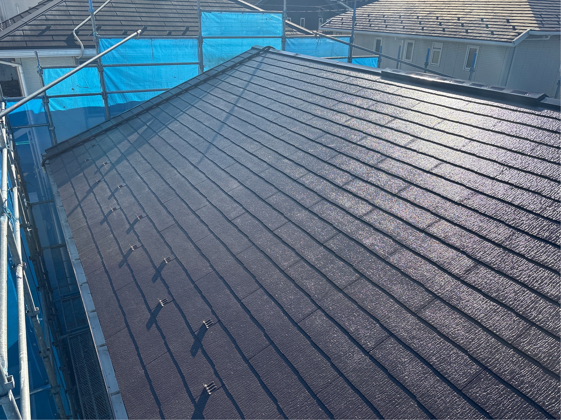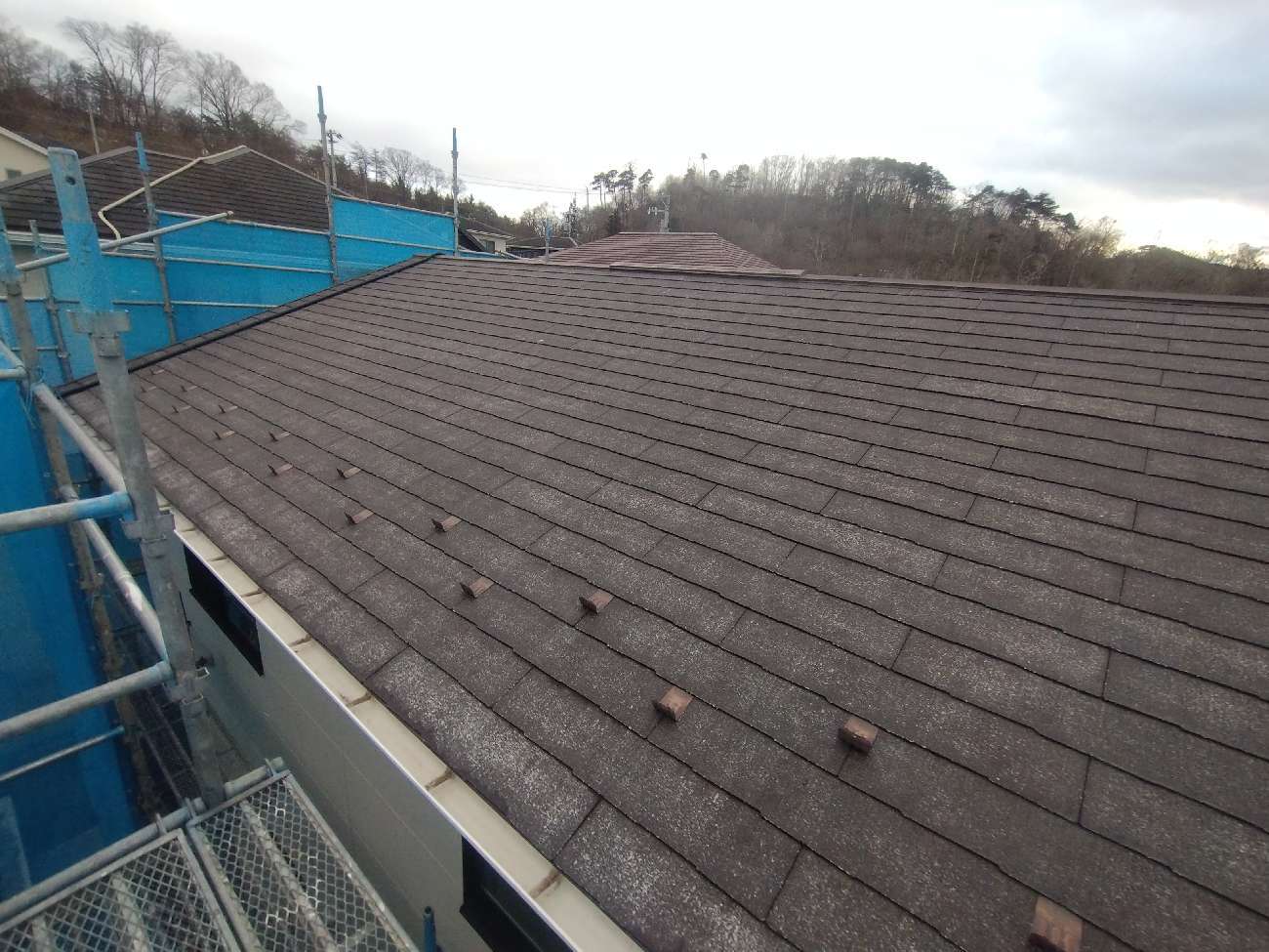 - 屋根がノンアスベストのスレート瓦だったので経年の割にクラックや劣化が目立ったため、通常一回の下塗りのところ二回塗りを行うご提案をしました。